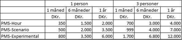 Priserne på licenser til de andre PMS-versionerne varierer 110 - 800 kr. per måned afhængig af valg af PMS-version, køb af antal licenser og varigheden af licenserne